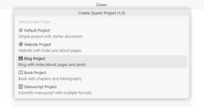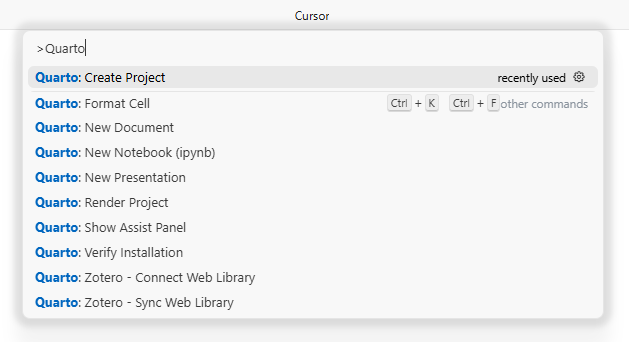 1. 打开cursor命令面板,输入Quarto:Create Project创建项目