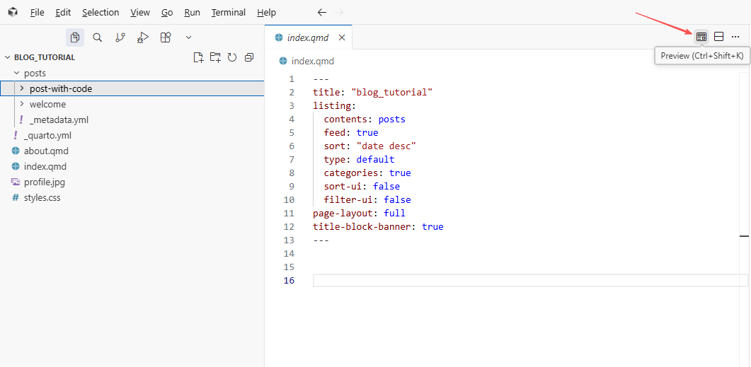 6. 点击右上角“预览”按钮,quarto将为你渲染博客网站